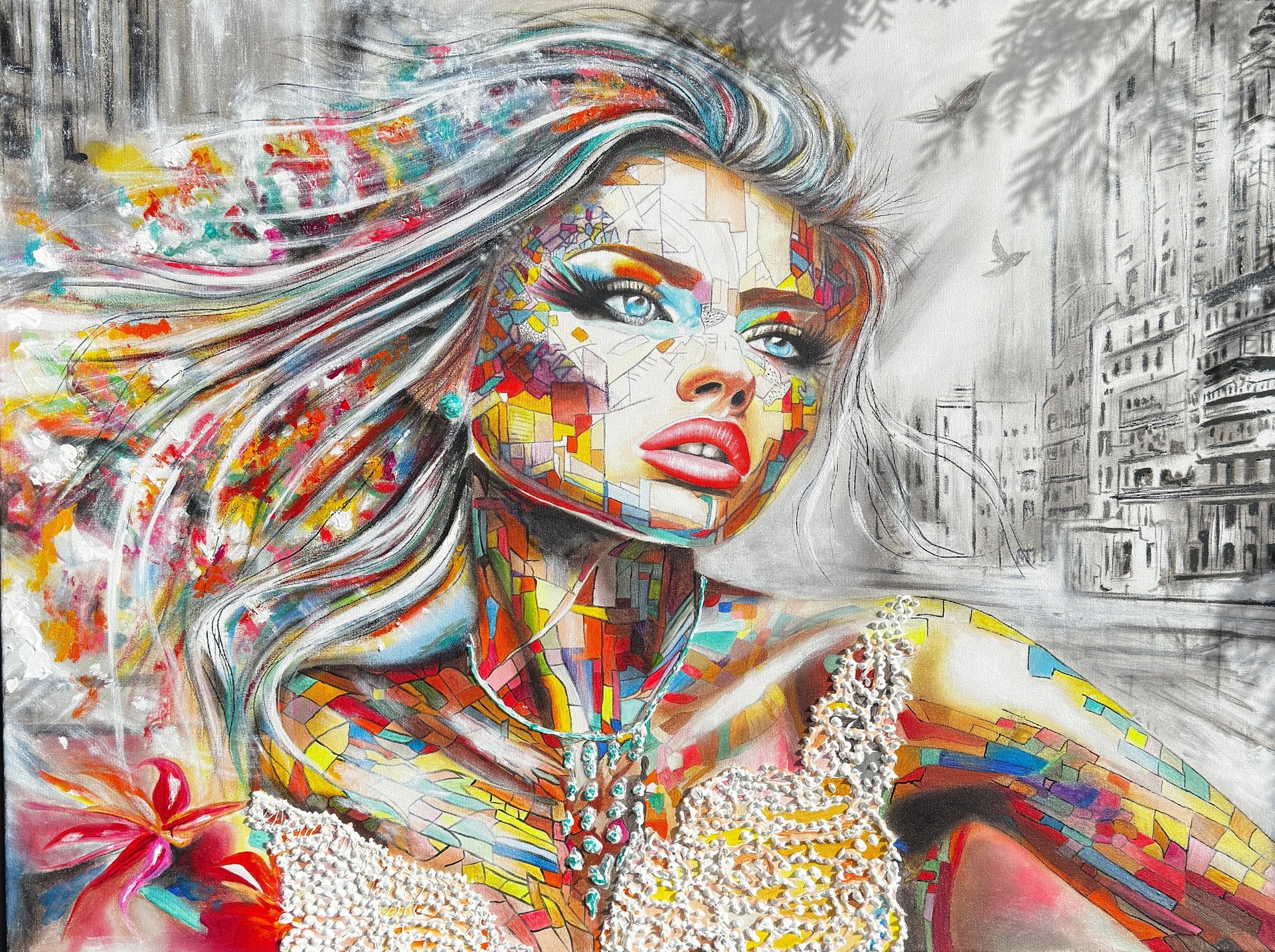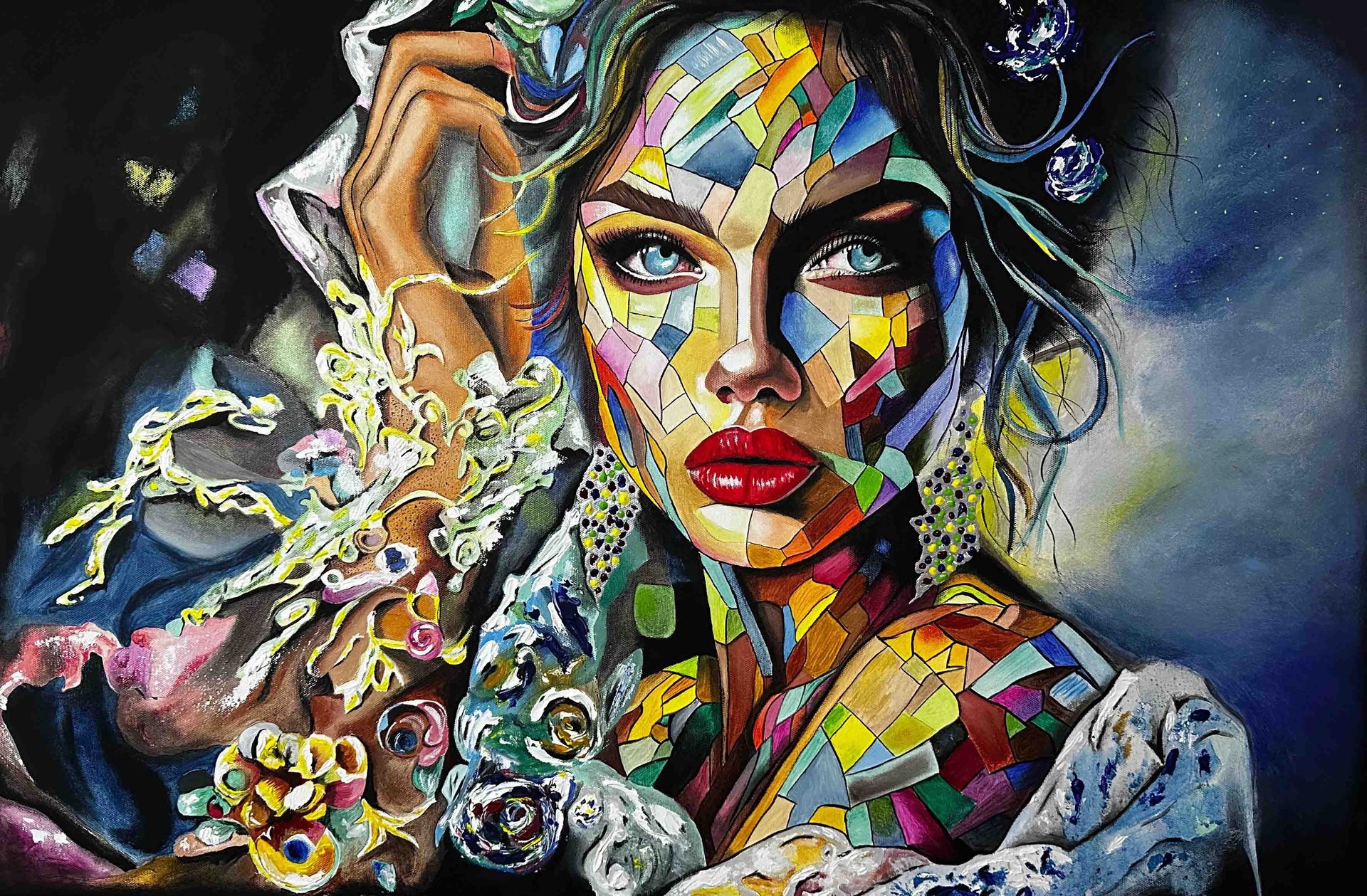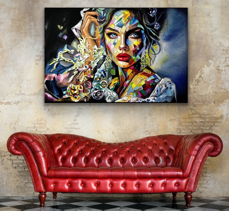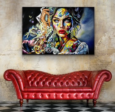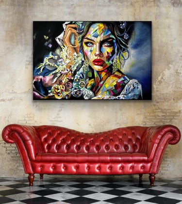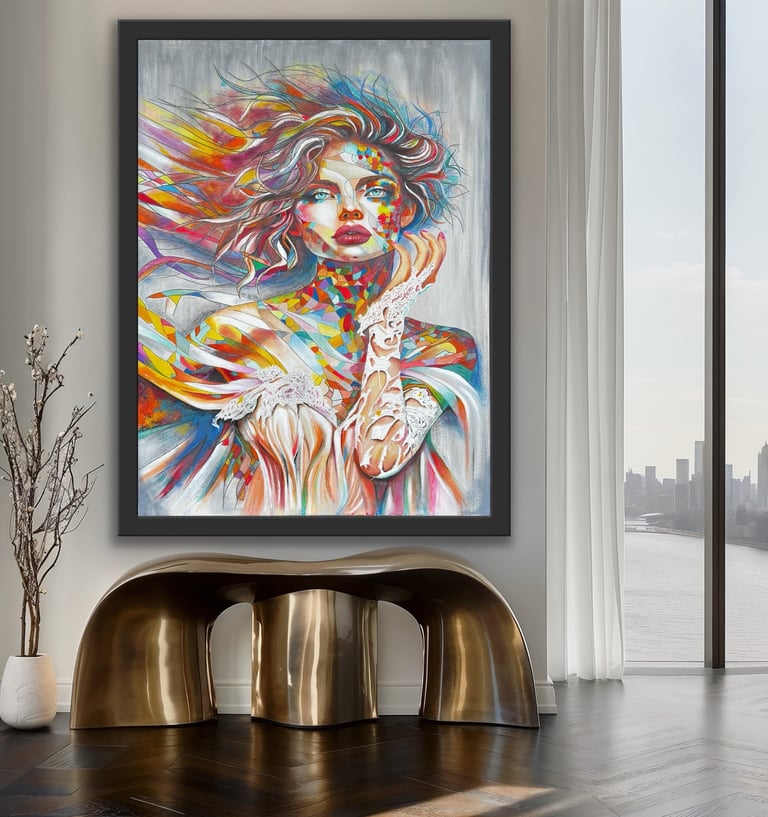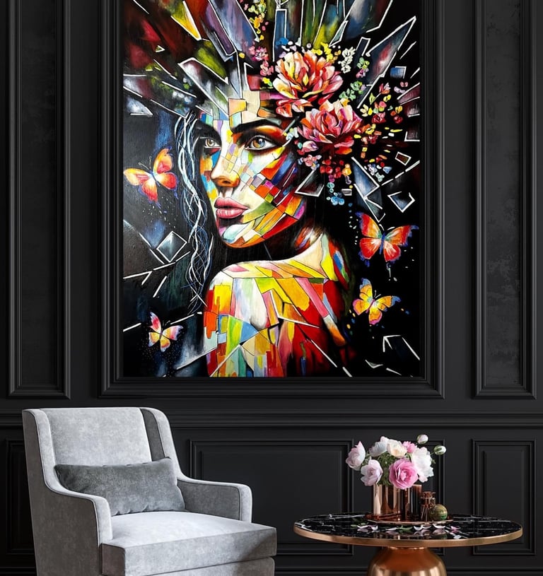 Her work combines elements of abstraction and portraiture, using vibrant colour and layered textures to create powerful visual narratives. Each piece invites the viewer to reflect on the many emotional landscapes that shape who we are.